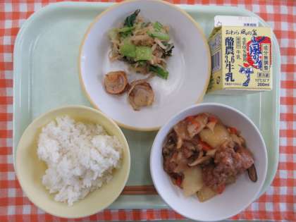今日の献立は、ごはん、ホタテの香味焼き、はりはりあえ、酢豚、牛乳です。