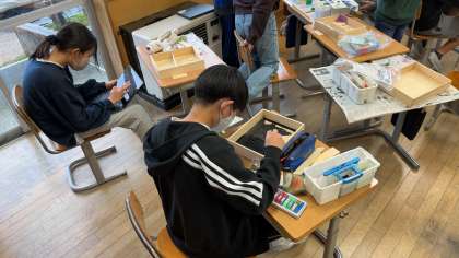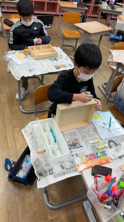 まずは、箱の色付けから。美しい仕上がりとなるように、見通しをもって進めます。