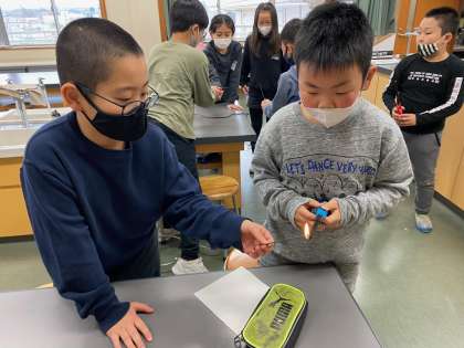 電熱器に近づけると、煙がたくさん出てくることに驚く子供たちでした。