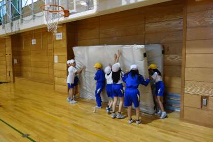 セーフティーマットを協力して片付けています。初めは重くて、上手く運べなかった子供たちですが、上手に片付けることができるようになりました。