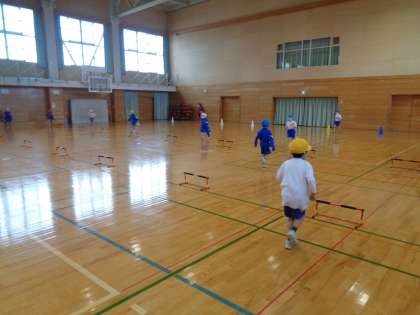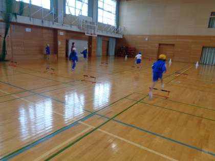 体育の時間は、ハードルリレーをしました。7分の間に何人走れるかを色団ごとに競いました。たくさん走っていっぱい汗をかきました。