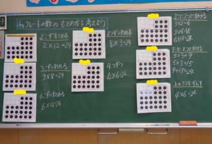 算数科では、同じ数のまとまりに着目して、はこの中に並んだチョコレートの数をかけ算の式に表して求める問題に取り組みました。2つずつや、3つずつ、6つずつのまとまりを作ったり、大きく2つのまとまりに分けて考えたり、チョコレートをずらして1つのまとまりをつくったりと、様々な考えが出され、友達とにているところや、思いつかなかった求め方をノートにまとめました。