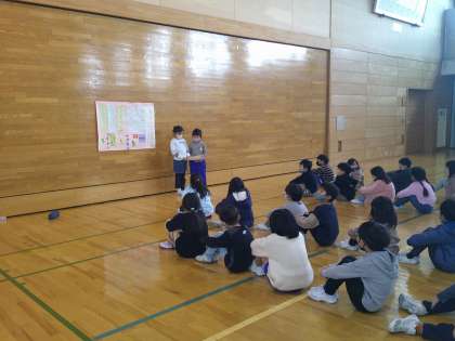自分たちで、司会や、はじめ・終わりの言葉を言う役割を決め、プログラムもかいて「2学期 みんながんばったね集会」を開きました。「みんな なかよし」の目当てを意識し、楽しい時間を過ごしました。