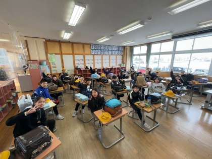 「さようなら」の前に集合写真。3学期の始業式は、みんな元気に登校してきてください。