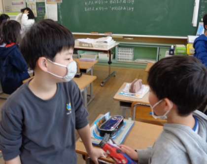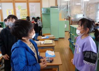 2学期がんばったことを友達同士伝え合いました。じゃんけんで、まず勝った人から、次に負けた人が、自分のがんばりを伝え、聞いている人は「がんばったね!」と相手をたたえます。10分足らずの短い時間でしたが、たくさんの友達とがんばったことや、がんばりをたたえる気持ちを伝え合い、2学期のがんばりを実感していました