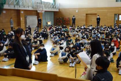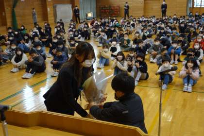 今学期いっぱいでご退職される先生との離任式を行いました。代表児童が感謝の気持ちを述べたり、花束を渡したりしました。ありがとうございました。