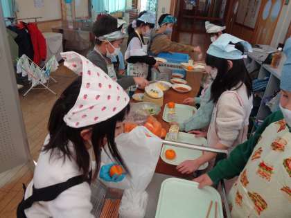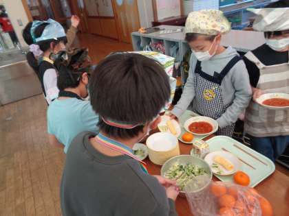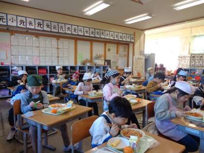 今学期最初の給食は、ソフト麺でした。新しい服や白い服にミートソースをとばしてしまった人もちらほらいました・・・。しっかり栄養補給をし、昼からの学習に備えました。