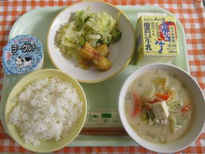 今日の献立は、ごはん、ちくわのカレー揚げ、あわせあえ、豆乳汁、ヨーグルト、牛乳です。