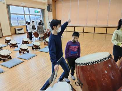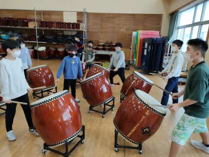 毎年この時期になると、6年生から4年生への太鼓の引き継ぎ活動が行われます。今年度は、「大河」「大空」の2曲を引き継ぎます。役割分担を終えた4年生は、早速同じパートの6年生に教えてもらいながら、練習を始めました。