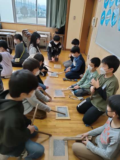 4年生 太鼓の引き継ぎ活動 6年生から4年生へ