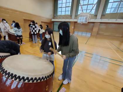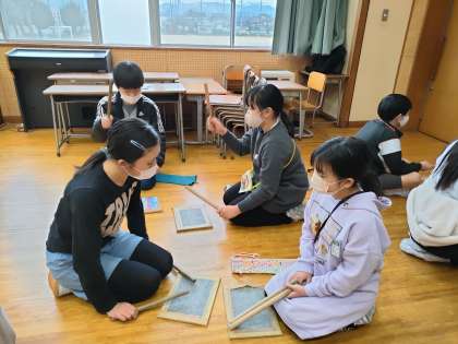 6年生は、何度も手本を見せたり、拍を取ったり、側で一緒に打ったりするなど、工夫しながら優しく教えてくれました。4年生も、その気持ちが伝わったのか、真剣な表情で練習に取り組んでいました。