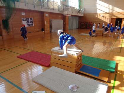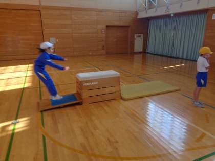 体育科では、跳び箱運動が始まっています。開脚跳びのポイントを確認しながら、取り組みました。