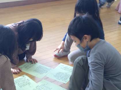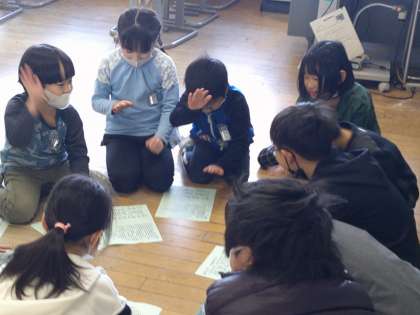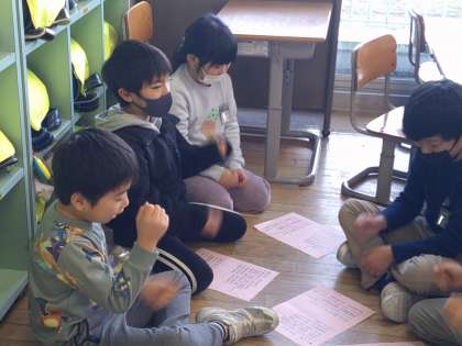 来年度、入学する保育所や幼稚園の友達に和太鼓の演奏を聴いてもらいたいと、各パートに分かれて練習を始めました。「どんつくどんつく どんつくどんどん」と口ずさみながらリズムをとり、手の動きを教え合いながら練習を進めていました。「少し自信が出てきた」と笑顔の子供たちです。