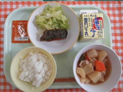 今日の献立は、ごはん、ゆでキャベツ、魚のえごまだれ、大根と豚肉の煮込み、穀物ふりかけ、牛乳です。