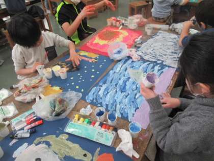 今日の図画工作科の学習では、とろとろ粘土に絵の具を混ぜて、手で絵をかきました。