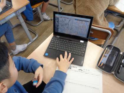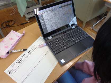 宮野地区の変遷について学習しています。今日は、インターネットサイトを用いて、今と昔の地図を見比べました。100年ほど前には、ねむの木に家が全くないことや、神通川を渡る橋がないことに気付きました。「昔は人があまりいなかったのかなあ」や「川は船で渡っていたのかな」などたくさんの問いを見つけました。