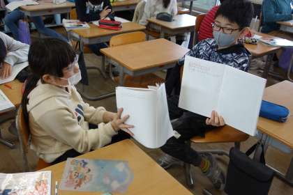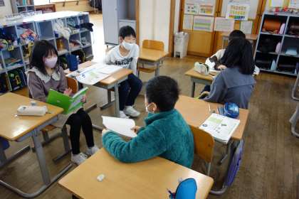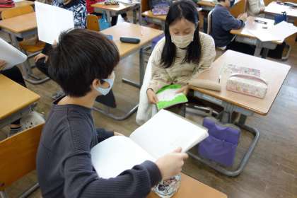 理科の学習の様子です。2枚の写真を見て、どうして水が凍ったのかを伝え合いました。生活経験をもとに自分の考えを話していました。