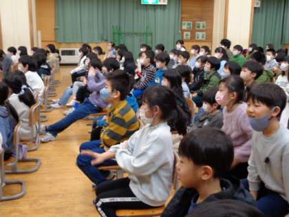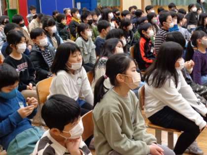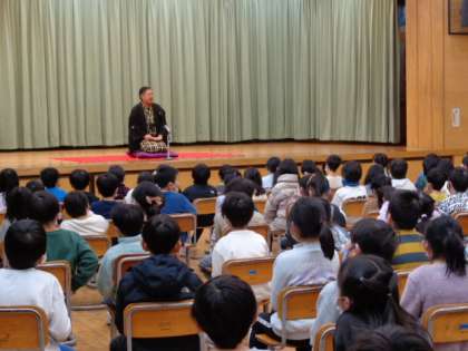 三遊亭楽楽師匠の落語鑑賞会がありました。声色や表情を変えて、いろいろな人物を演じ分ける「みそまめ」や「てんしき」等の落語を聞いて、子供たちは落語の面白さを存分に味わっていました。