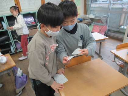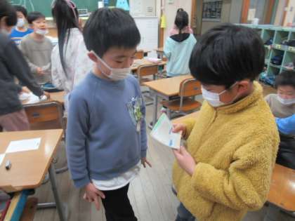 今日の生活科では、友達のがんばっていたことをメッセージカードに書いて、友達に渡しました。