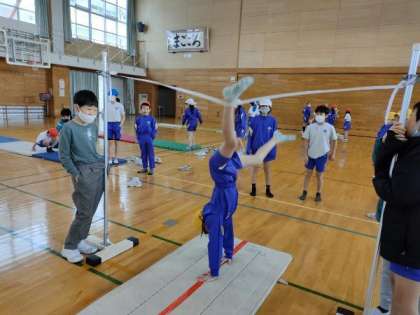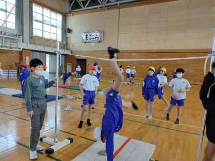 次の体育の時間に、発表会を控えた子供たちは、一つ一つの技を磨くのに一生懸命です。今日は、「先生、側転の足が上がりません」と相談してきた子供たちのために、ちょっとした工夫を加えた練習の場を準備しました。「もっと足を伸ばして」「もっと腰を高くして」と繰り返し言うよりも、ずっと効果的です。子供たちの足は自然と伸びていきます。周囲の友達と相互評価を行いながら、自主的に学び合う子供たちの姿が素敵でした。