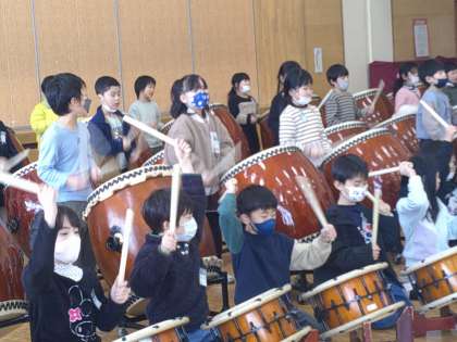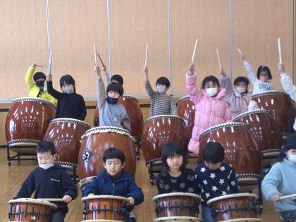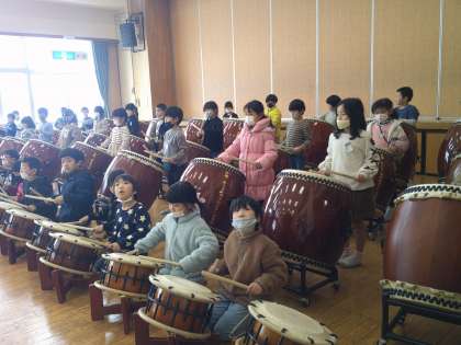 4つのパートのリズムが合うように、お互いの音を聞きながら太鼓をたたくことを意識して練習に取り組んでいます。今度、宮野小学校に入学する年長さんに、かっこいい姿を見せようと頑張っている1年生の子供たちです。