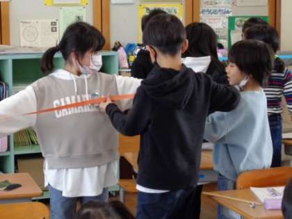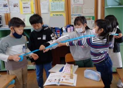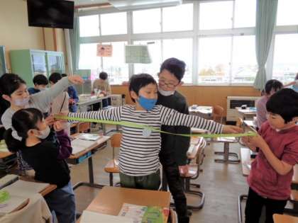 算数科「長い長さをはかってあらわそう」の学習で、両手を広げた長さを調べました。班で協力して、テープに写しとってから、30cm物差しを使ってはかりましたが…何回も印をつけたり、計算が面倒だったり。ここは、やはり、1m物差しが便利だと気づきました。