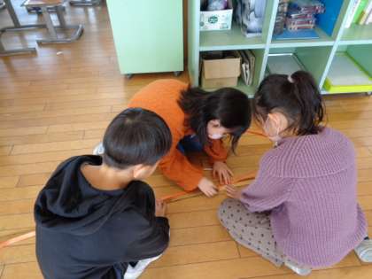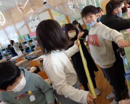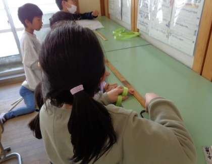 昨日、テープに写し取った両手を広げた長さを、今日は、1m物差しを使って、測りました。やはり、長い長さを測るには、1m物差しの方が便利だということを実感していました。測った長さを、○m○cmと、○cmの両方で表しました。