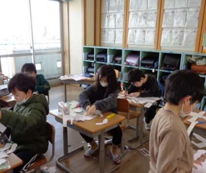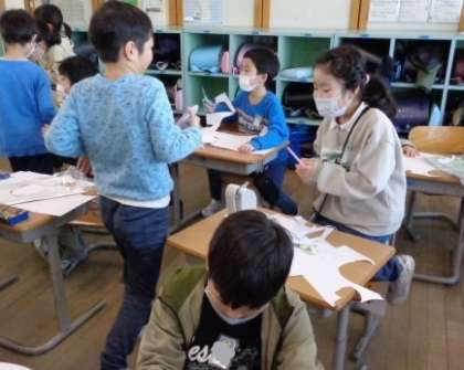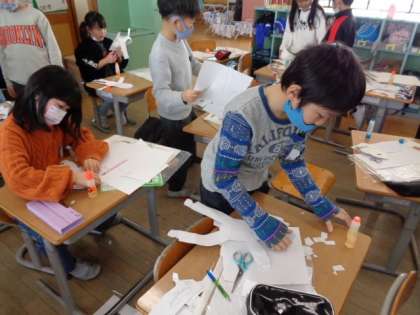 図画工作科では、「○○をしているぼく、わたし」を紙版画で表しています。腕や足を関節で曲げられるようにし、いろいろな動きを表したり、模様を生かして洋服を作ったり、手順を考えながら工夫して取り組んでいます。