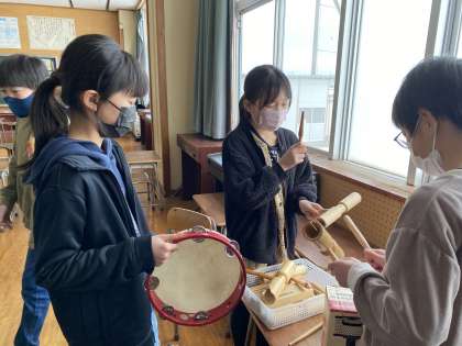 打楽器でのアンサンブルを計画しています。今日は、それぞれの楽器の音色を確かめながらアンサンブルをする楽器の組み合わせを決めました。