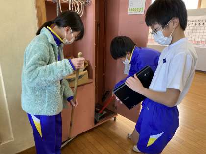 家庭科の学習で、校舎内の汚れているところを掃除しました。汚れに合わせて掃除の仕方を工夫しました。