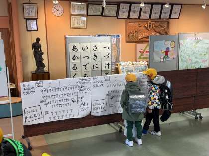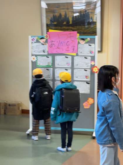 和太鼓演奏会の隊形図や給食週間の手紙などが掲示されています。前を通る子供たちが立ち止まり、しっかりと見てくれています。