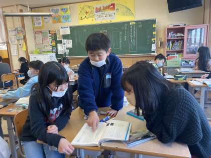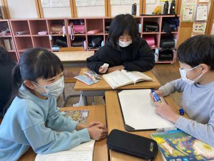 長い説明文を読んでいます。文章を読んで、どこでまとまりに分けることができるのか班の仲間と話合いながら考えました。