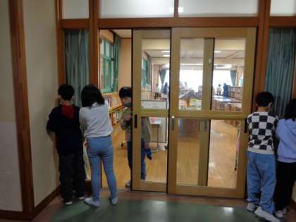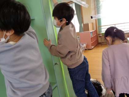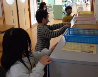 3mのテープを用意し、10cmごとに目盛りを書いて作ったテープ物差しを使って、学校のいろいろな場所の長さを測りました。テープ物差しを班で協力して作り、掃除ロッカーの高さや、お便りボックスの横幅、図書室の入り口など測りました。