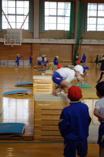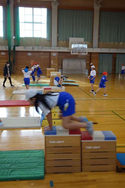 跳び箱運動の様子です。できるようになるまで何度もトライしています。