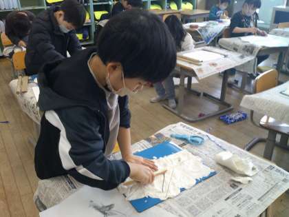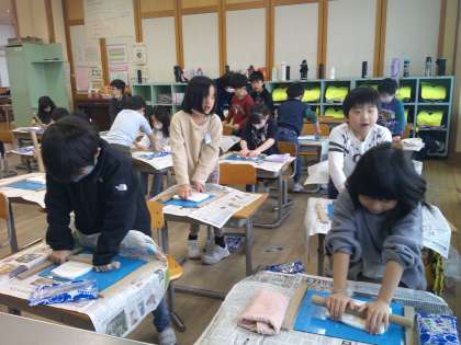 粘土を伸ばし、自分の好きな魚やかめ等の版をつくりました。用意してきたいろいろな型を使ってで楽しい模様をつけました。今度、刷るのが楽しみです。