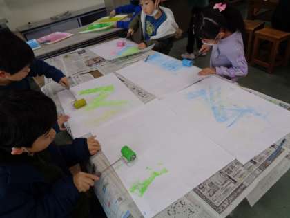 図画工作科の学習では、ローラー遊びをしました。初めて使うローラーに興味津々な様子の子供たち。思い思いにローラーを転がしていきます。