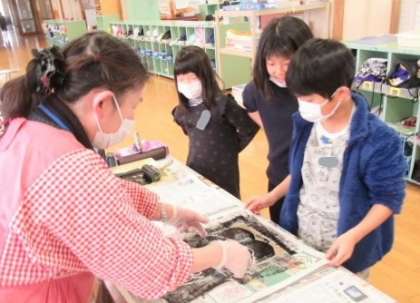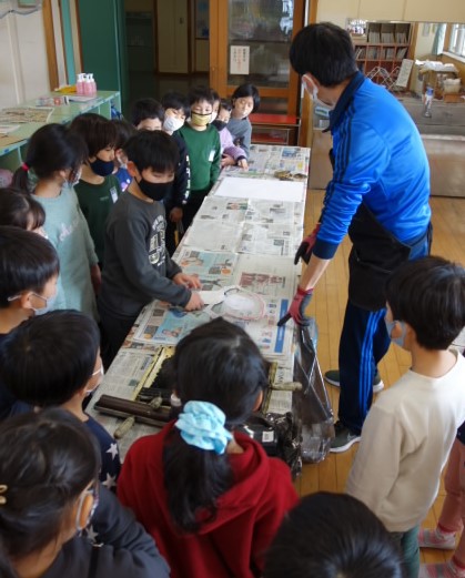 先日から取り組んでいる「○○をしているぼく、わたし」の版画を刷りました。ばれんで一生懸命刷り上げ、紙をめくったときには、完成が上がりました。キャンプをしている自分や、ほうきを持って掃除をしている自分など、ダイナミックな作品が仕上がりました。