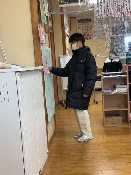 今週1週間を振り返り、6年生として行ったことをカードに書き、貼り付けている子供たち。カードに書きながら自分がしたことを自覚し、さらなる成長を目指します。