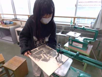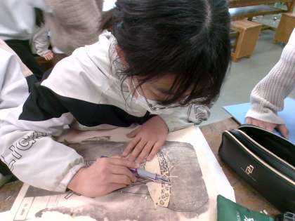 前回の授業で1回目の刷りを行った子もいます。その子は今日、刷った作品を見ながら修正ポイントを考え、彫り足しました。