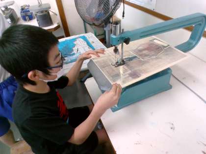 彫りが終わった子は、人物と背景を糸鋸で切断しました。