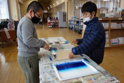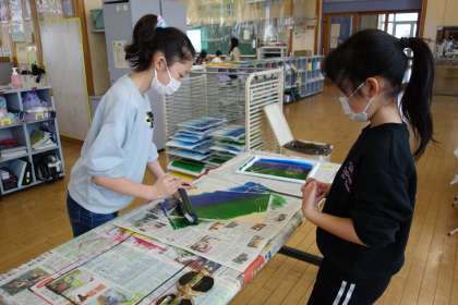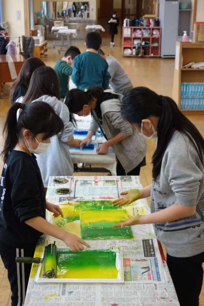2組も「刷り」を行いました。友達と助け合いながら、作業を進めていました。