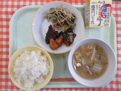 今日の献立は、ごはん、鶏肉とレバーのカレー風味、ナムル、たら汁、牛乳です。