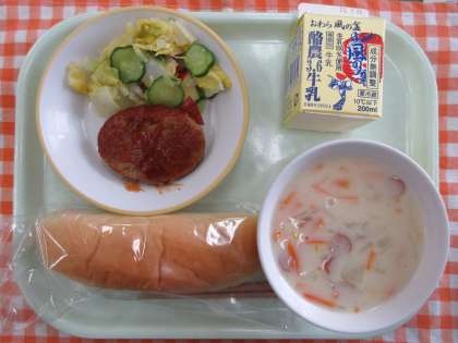 今日の献立は、コッペパン、ハンバーグのケチャップ煮、白菜とりんごのサラダ、コーンチャウダー、牛乳です。