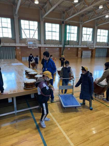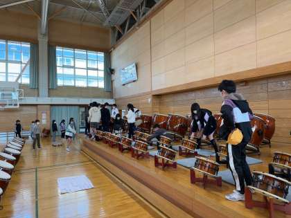 明日の和太鼓発表会のリハーサルに向けて、今日は体育館のステージを出し、太鼓を設置しました。これからの宮野小学校を背負う5年生が準備をしてくれました。
