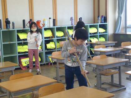 明日の和太鼓発表会に向けて、昼休みから掃除の時間にリハーサルを行っているグループがあったので、もう終わったグループの子供たちが教室をきれいに箒ではいてくれました。