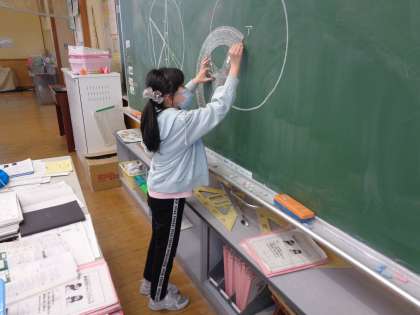 算数科では、円を使って二等辺三角形をかきました。円の性質を振り返りながら、きれいに作図することができました。