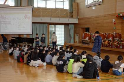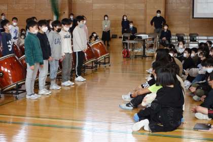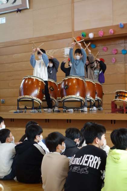 卒業を祝う会の様子です。4年生は、6年生に教えてもらった和太鼓を発表し、感謝の気持ちを伝えました。