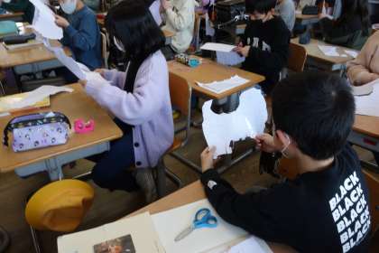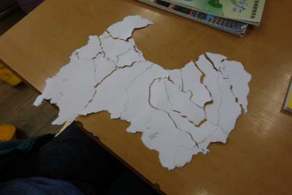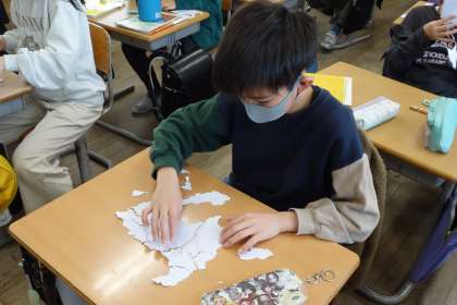 今回は、市町村のプリントを全て切り離し、パズルを作りました。形と場所を思いだし、組み立ててみました。予想以上に難しかったようです。繰り返しやって、市町村を覚えましょう。