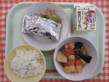今日の献立は、ごはん、サバの銀紙焼き、ごまびたし、関東だき、牛乳です。