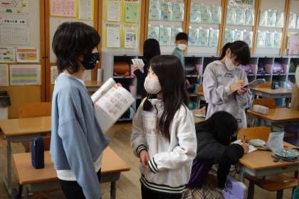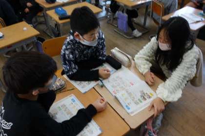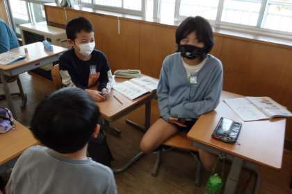 外国語活動の様子です。英語で「好きな場所」について交流しました。間違いを恐れず、進んで発音する姿が見られました。